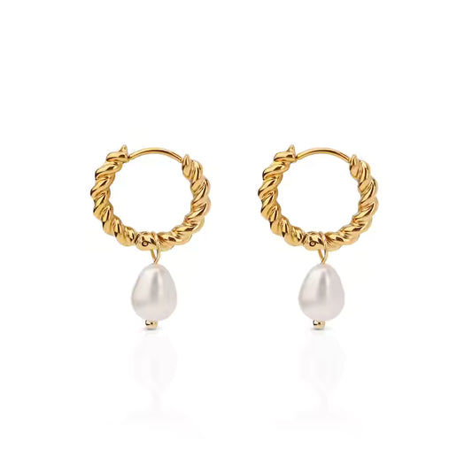 Golden warmth, pearly glow. The Soleil Pearl earrings feature delicate sweet water pearls suspended from a rope-twisted huggie hoop, crafted in 316L stainless steel with a radiant 18k gold PVD finish. A dreamy balance of texture, elegance, and soft sparkle — like sunshine dressed in pearls.